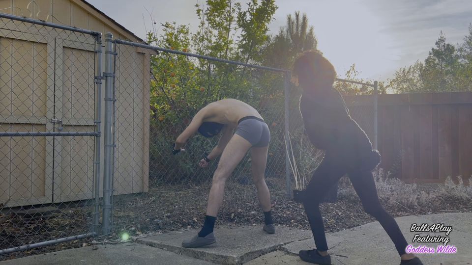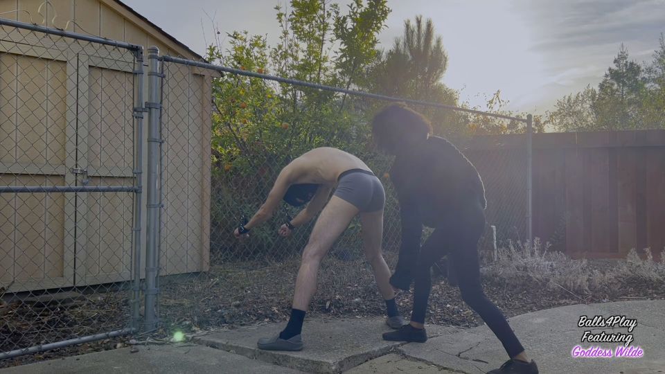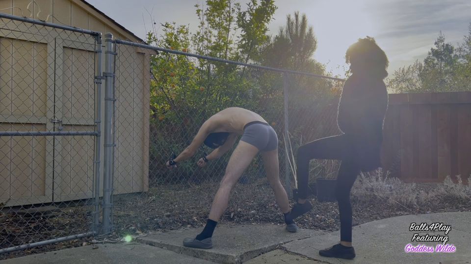 Goddess Wilde cuffs you to the fence and kick your balls to her liking. There are no survivors.