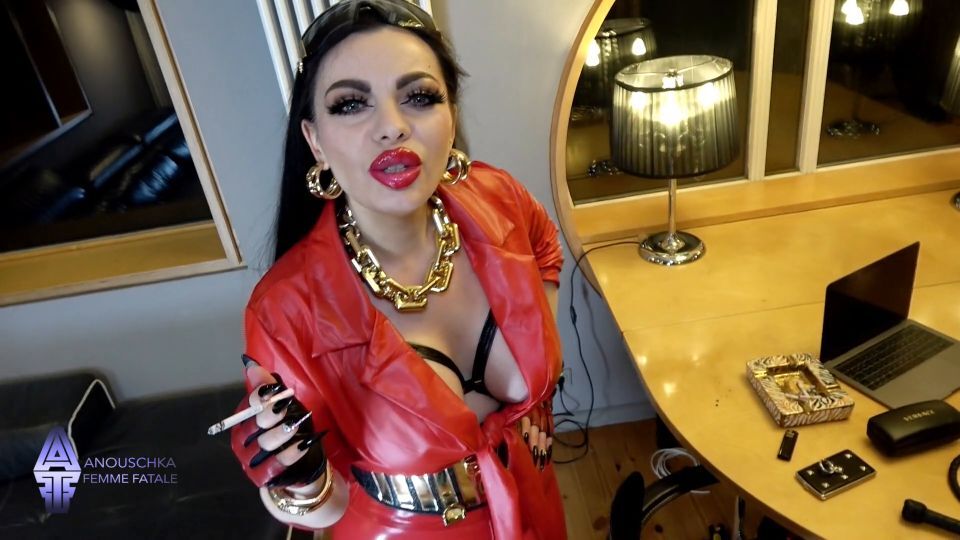 I am dressed up completely in red leather! Red leather leggings, leather blouse and fingerless leather gloves. As I come to my executive office there is the cable guy. He should have fixed the wires of my internet while I was in a meeting. But he did not finish yet. I get very angry and must punish him for his lousy work. I tie him up on my electric winch in a suspension position and whip him. I see he is getting hard from that so I whip him more and tell him to cum on my leather ass in my tight, shiny leggings. That for I jerk him off with my fingerless leather gloves till his white cream shoots on my red leggings.