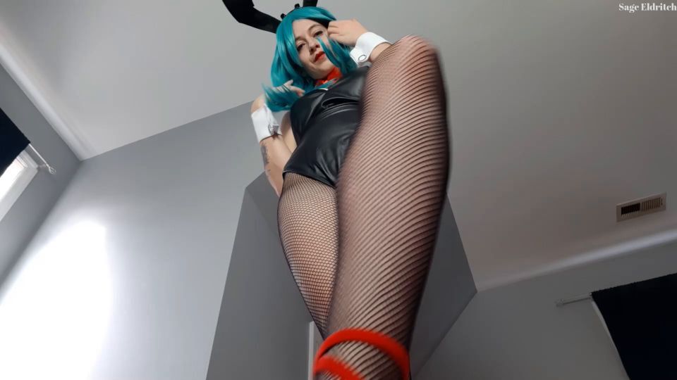 Sage Eldritch is costumed as Bulma [from Dragonball] in her bunny costume, fishnets, and red high heels. Already laying on the floor, you look up to see her standing above you. She walks on and tramples you, digging her heels into you as she teases you with her body from above.