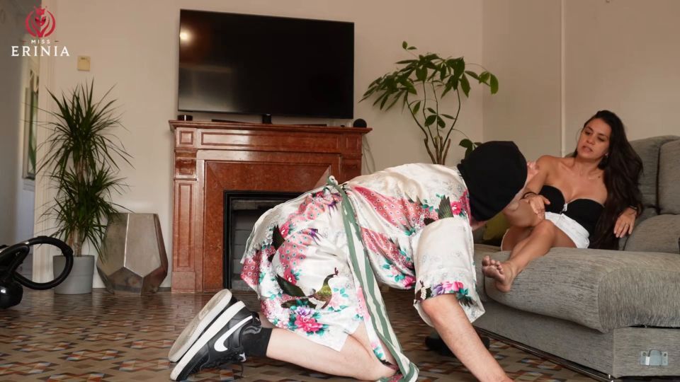 Mistress Erinia is pissed off with her submissive. She finds the house dirty even though she told him to leave it clean. And the slave will suffer the consequences. Mistress Erinia will kick him in the balls. She will have to perform a foot fetish on him until her Mistress is satisfied, and she will clean the dirt from the house floor by running her tongue over the sole of her Goddess’s foot.