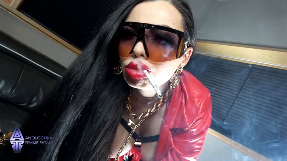 I seduce you in my stunning full leather outfit with my smoke and spit! Get mesmerised from my heavy puffy clouds of smoke and swallow my delicious spit! I give you a hot show in tight black leather leggings combine with spike heeled leather boots and a red leather top with a deep cleavage. Inhale my smoke and look at my shiny white tits. Jerk for me, I want your cum!